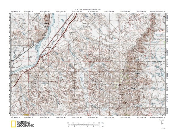 Figure 5: South end of Cottonwood Creek-Powder River drainage divide area. United States Geological Survey map digitally presented using National Geographic Society TOPO software.