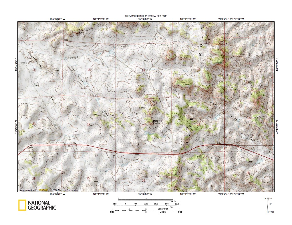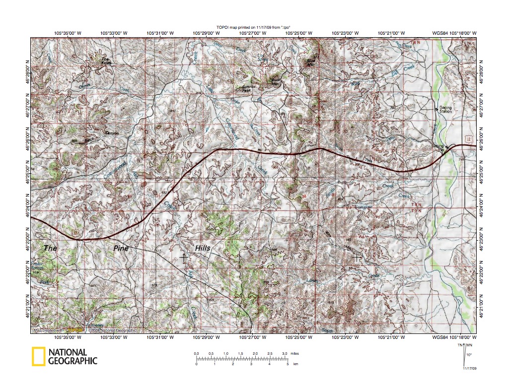 Figure 3: North end of Yellowstone River-Powder River drainage divide area. United States Geological Survey map digitally presented using National Geographic Society TOPO software.