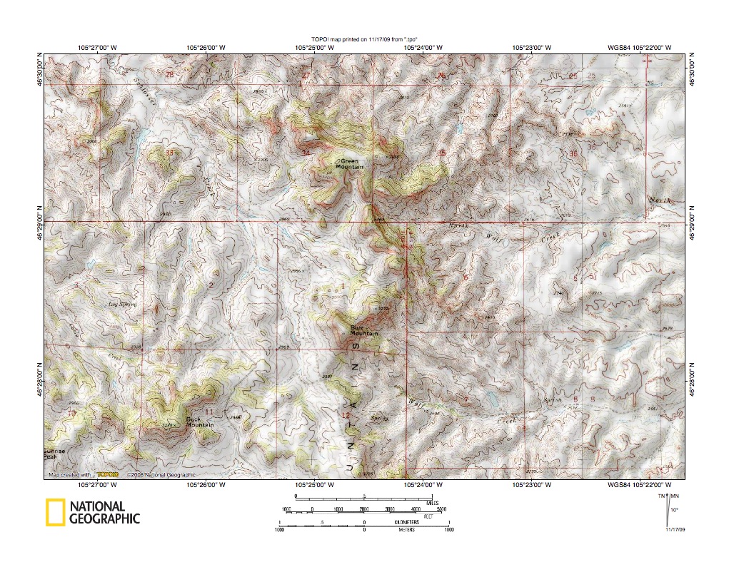 Figure 10: Tongue River-Powder River drainage divide area. United States Geological Survey map digitally presented using National Geographic Society TOPO software.