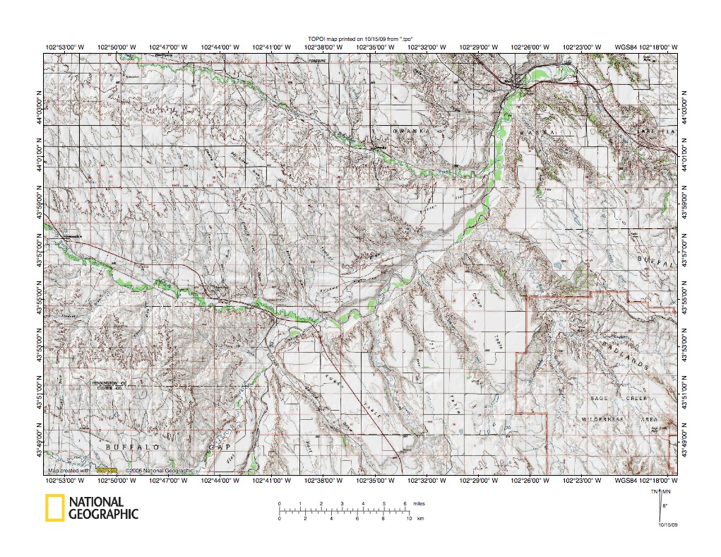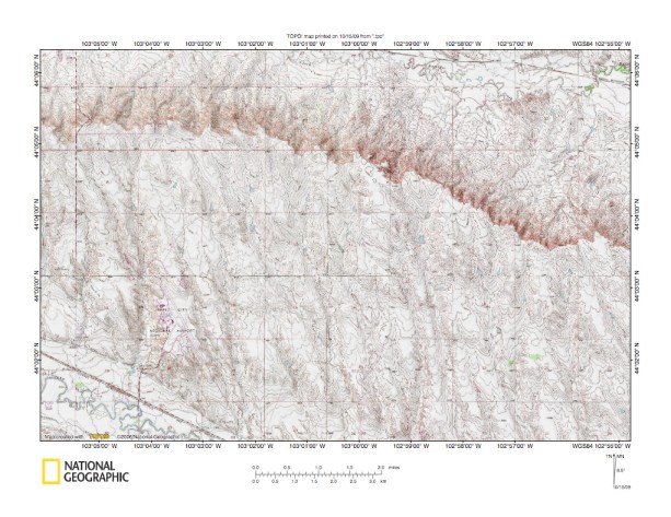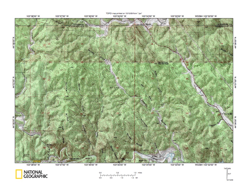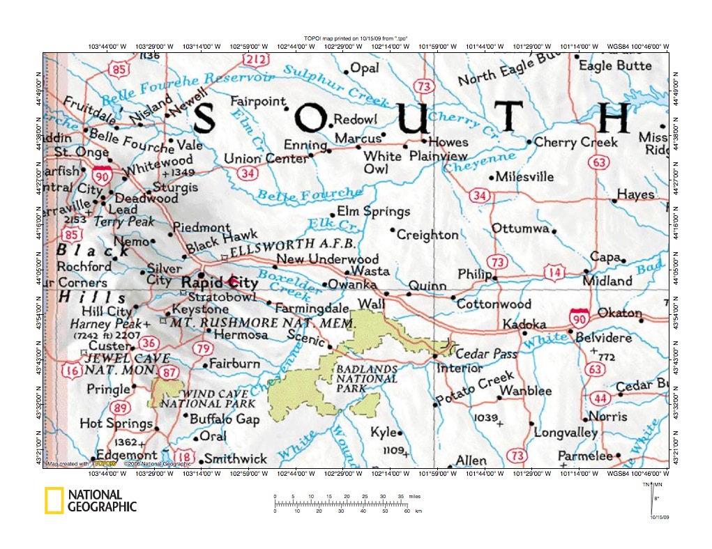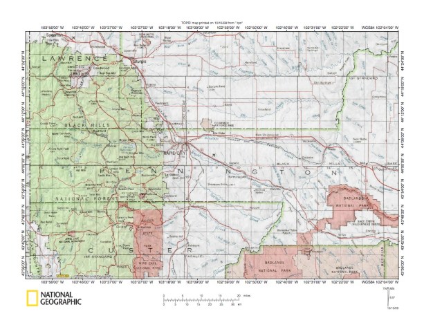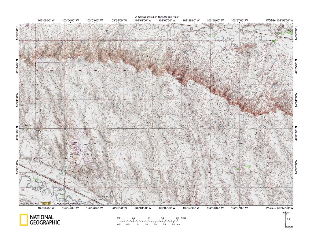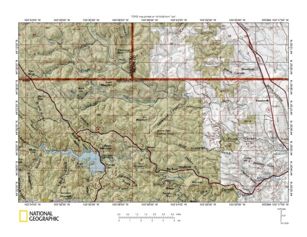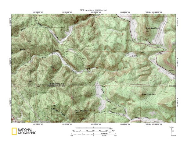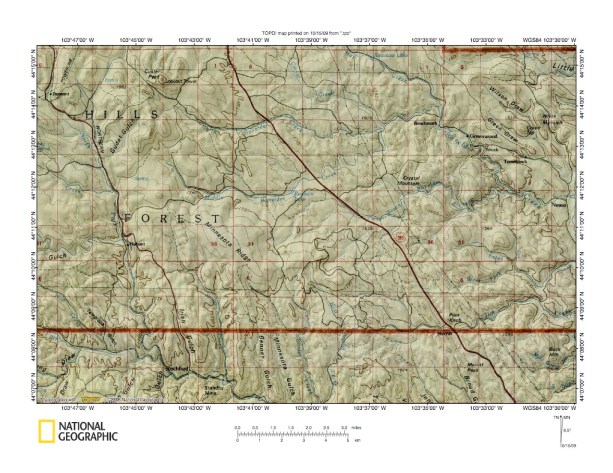 Figure 10: Boxelder Creek-Rapid Creek drainage divide area west of Cheyenne River. United States Geological Survey map digitally presented using National Geographic Society TOPO software.