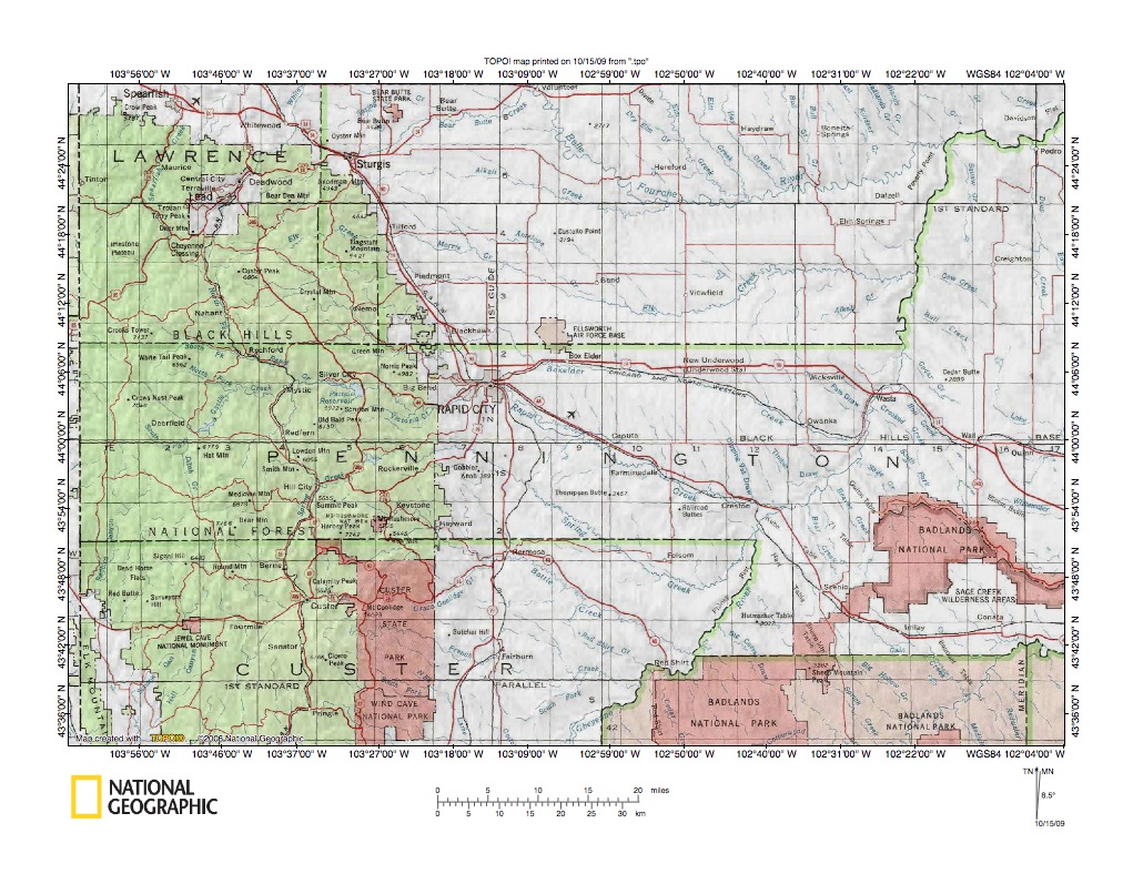 Figure 1: Boxelder Creek-Rapid Creek drainage divide area general location map (select and click on maps to enlarge). National Geographic Society map digitally presented using National Geographic Society TOPO software.