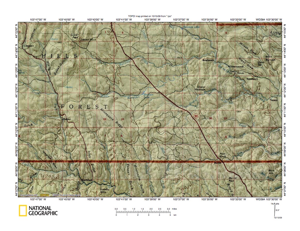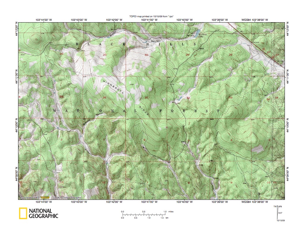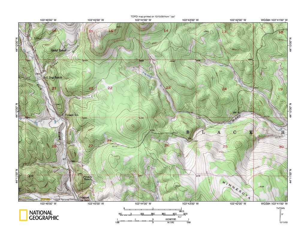 Figure 5: Middle Boxelder Creek-Rapid Creek drainage divide area at Minnesota Ridge. United States Geological Survey map digitally presented using National Geographic Society TOPO software.