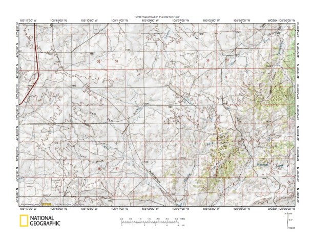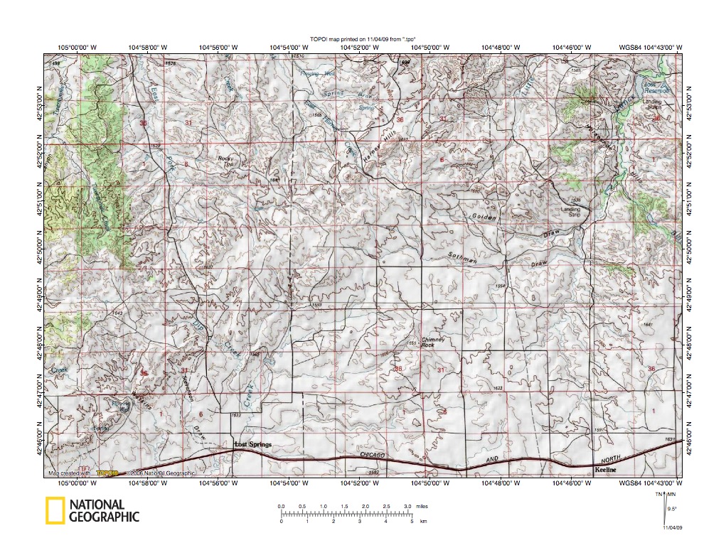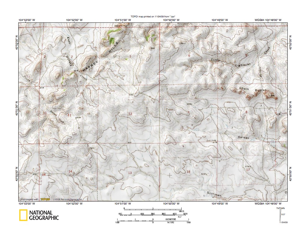 Figure 3: Lightning Creek-Lost Creek-Lance Creek drainage divide area. United States Geological Survey map digitally presented using National Geographic Society TOPO software.