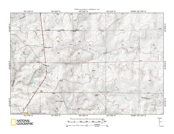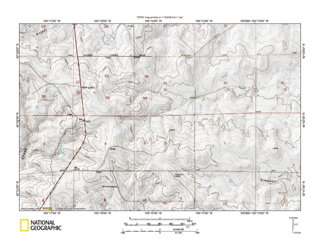 Figure 8: Walker Creek-Antelope Creek-Simpson Draw drainage divide area. United States Geological Survey map digitally presented using National Geographic Society TOPO software.