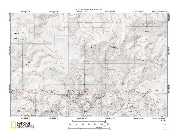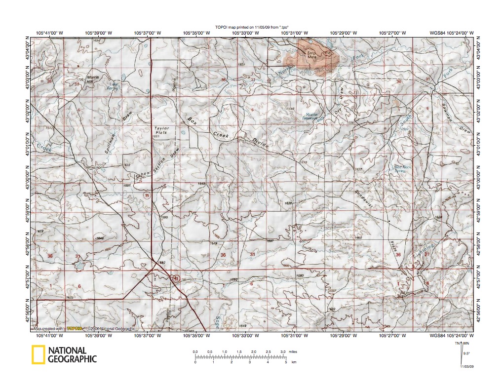 Figure 10: Sage Creek-Box Creek drainage divide at Box Creek Divide. United States Geological Survey map digitally presented using National Geographic Society TOPO software.