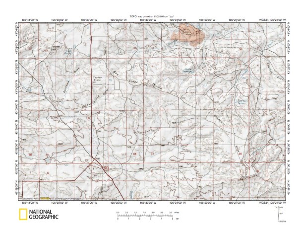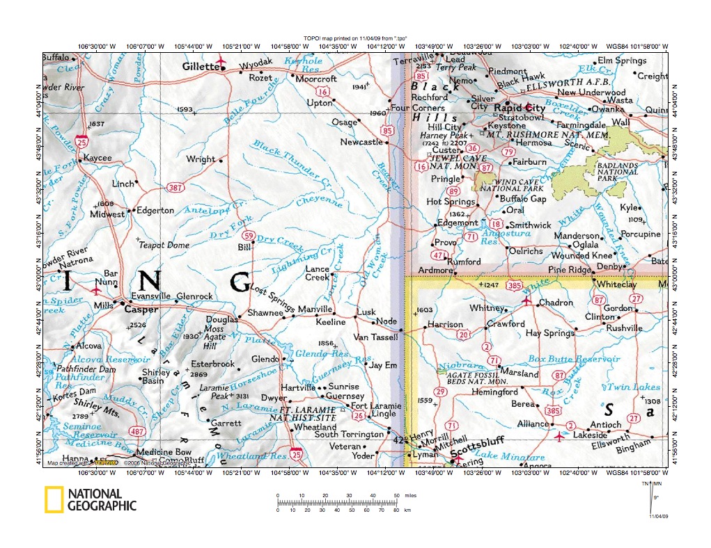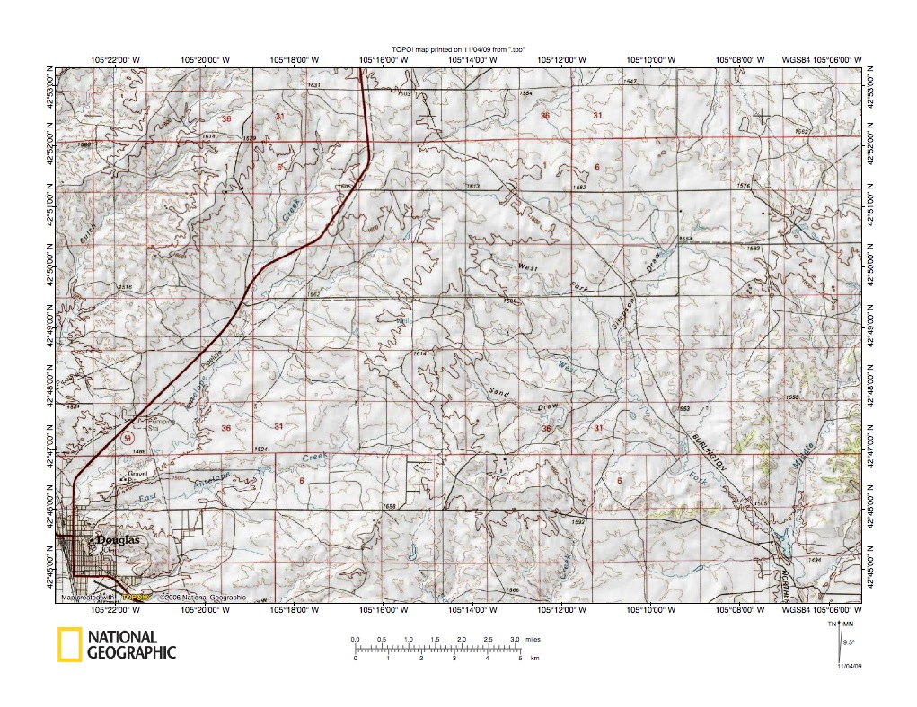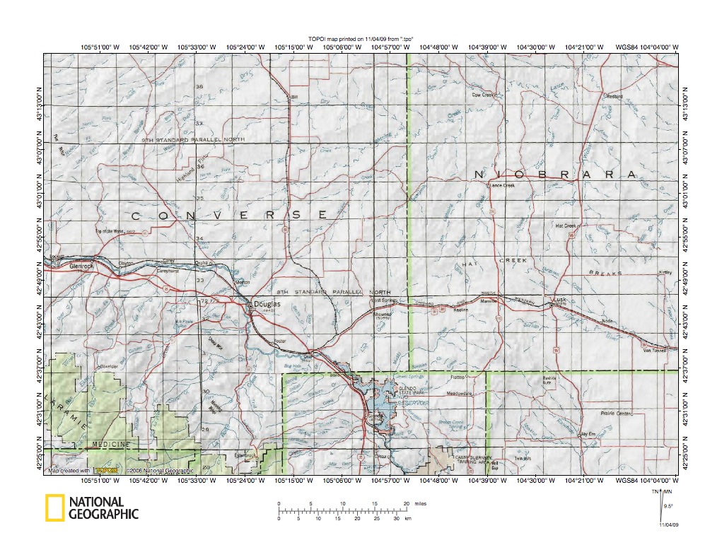 Figure 1: Lightning Creek-North Platte River drainage divide area location map (select and click on maps to enlarge). National Geographic Society map digitally presented using National Geographic Society TOPO software.