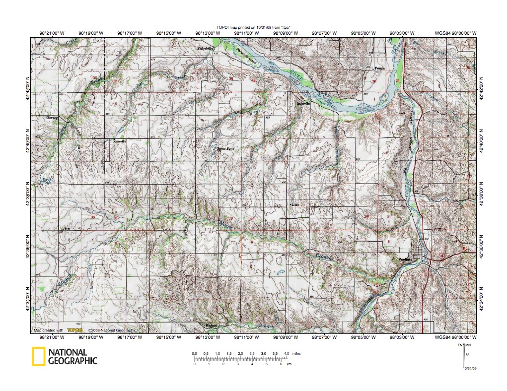 Figure 3: Niobrara River-North Branch Verdigre Creek drainage divide area. United States Geological Survey map digitally presented using National Geographic Society TOPO software.