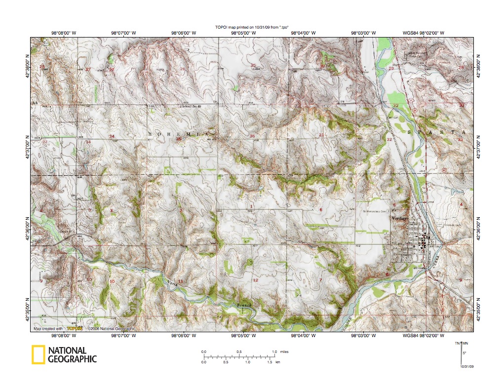 Figure 6: Detailed map of Middle Branch Verdigre Creek-Verdigre Creek drainage divide area. United States Geological Survey map digitally presented using National Geographic Society TOPO software.