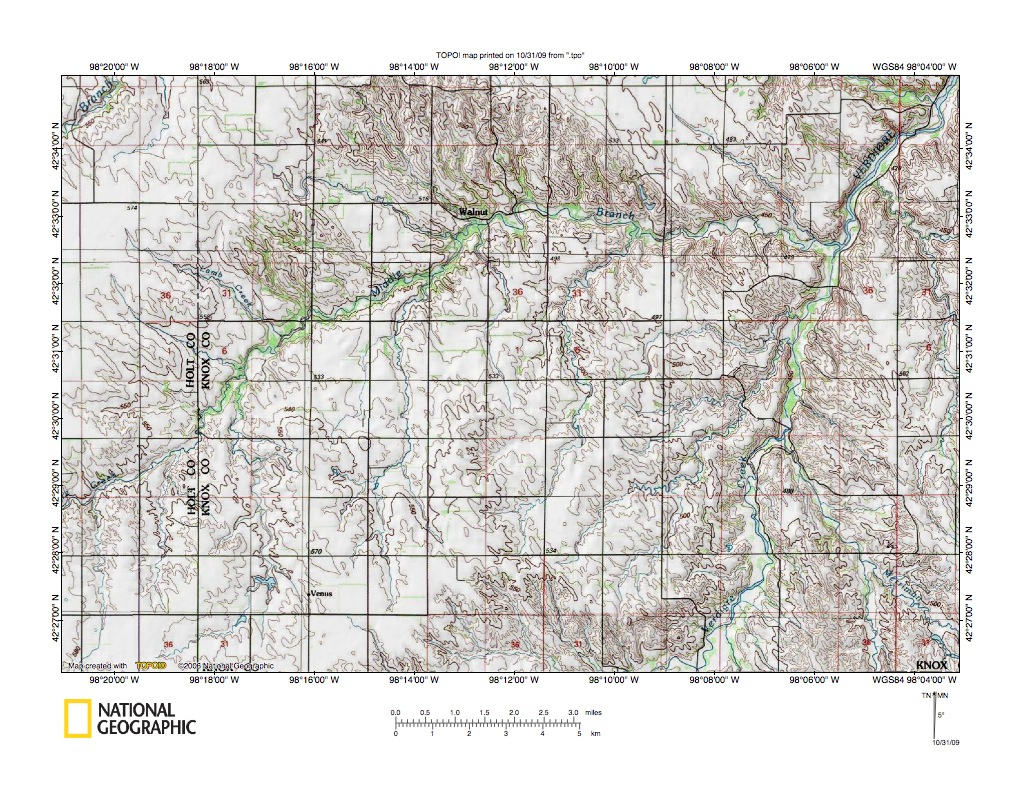 Figure 5: Middle Branch Verdigre River-Verdigre Creek drainage divide area. United States Geological Survey map digitally presented using National Geographic Society TOPO software.