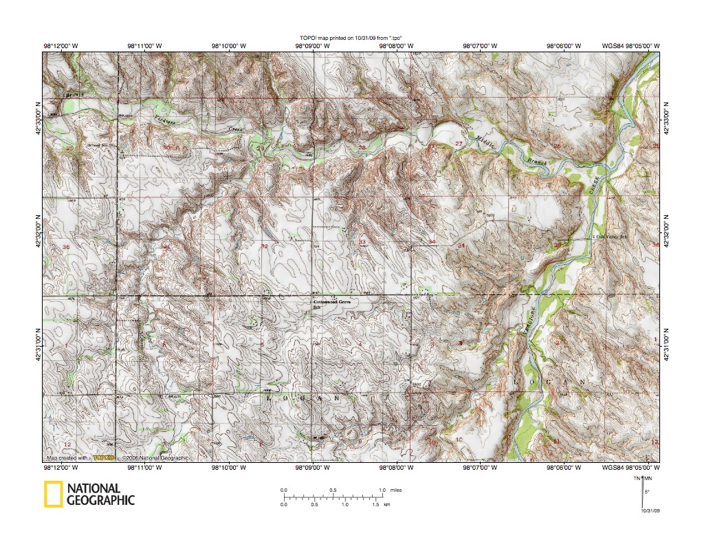Figure 10: West end of the Niobrara River-Elkhorn River drainage divide area. United States Geological Survey map digitally presented using National Geographic Society TOPO software.