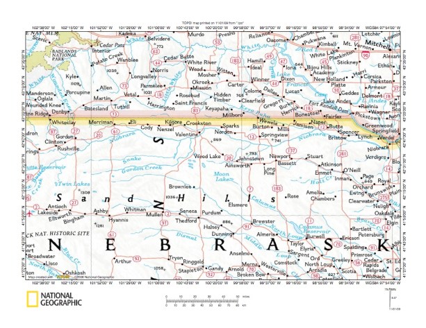Figure 1: Niobrara River-North Loup River drainage divide area general location map (select and click on maps to enlarge). National Geographic Society map digitally presented using National Geographic Society TOPO software.