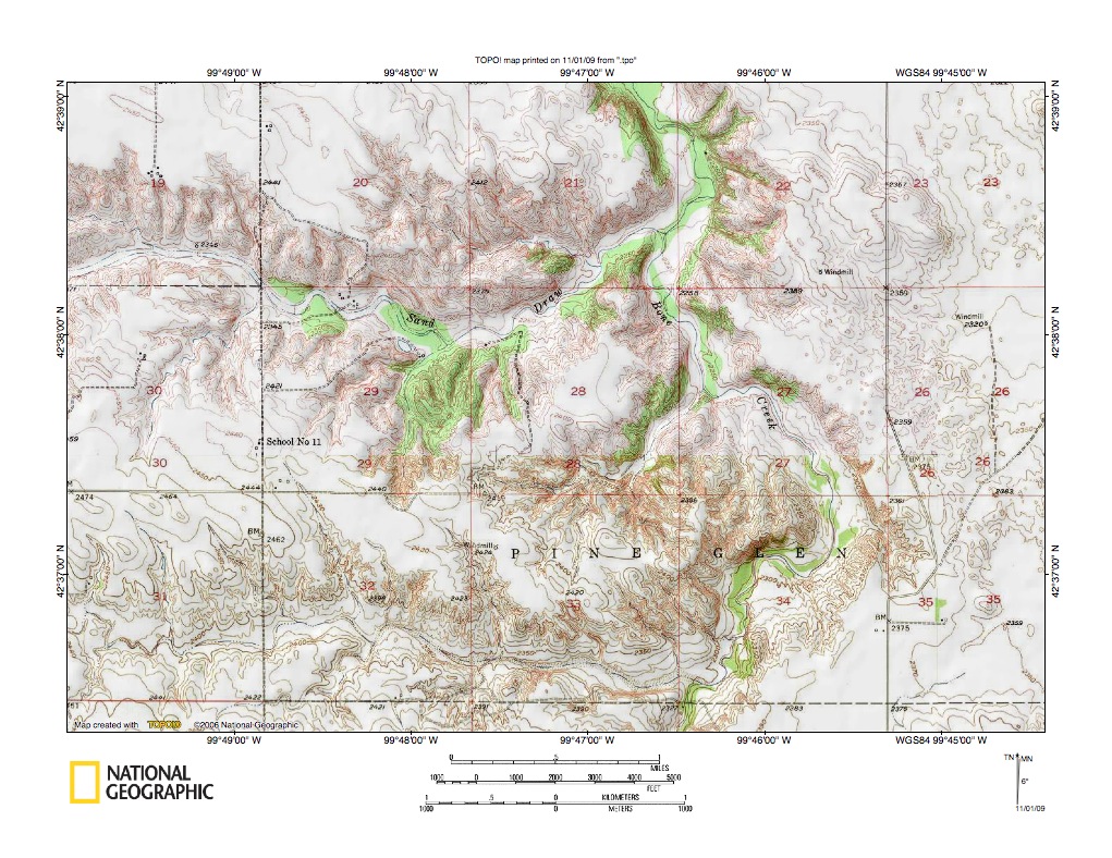 Figure 6: Detailed map of Sand Draw-Bone Creek tributary drainage divide. United States Geological Survey map digitally presented using National Geographic Society TOPO software.