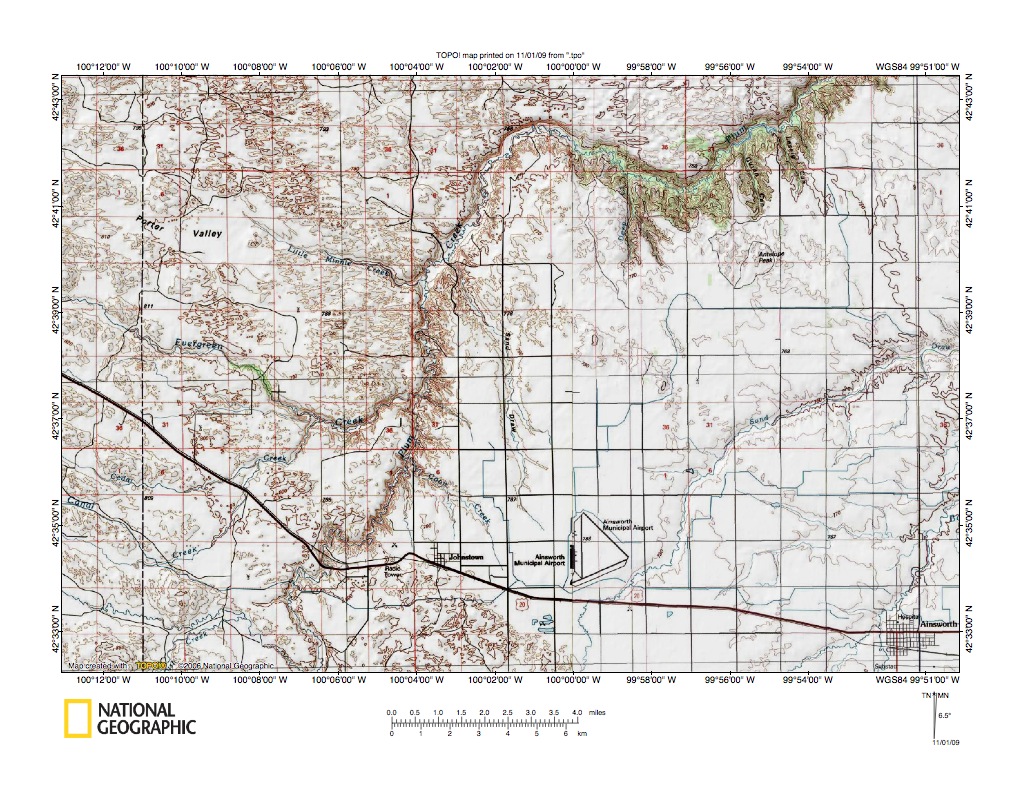 Figure 3: Niobrara River tributary valleys in Ainsworth and Long Pine area. United States Geological Survey map digitally presented using National Geographic Society TOPO software.