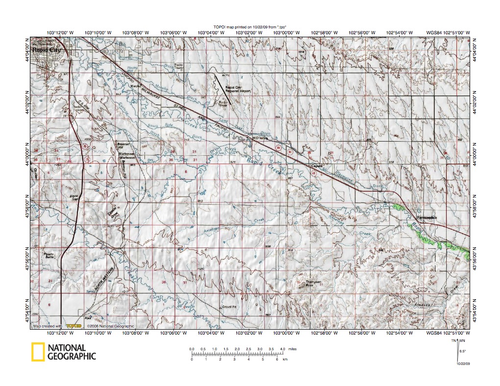 Figure 8: Rapid Creek-Spring Creek drainage divide area southeast of Rapid City. United States Geological Survey map digitally presented using National Geographic Society TOPO software.