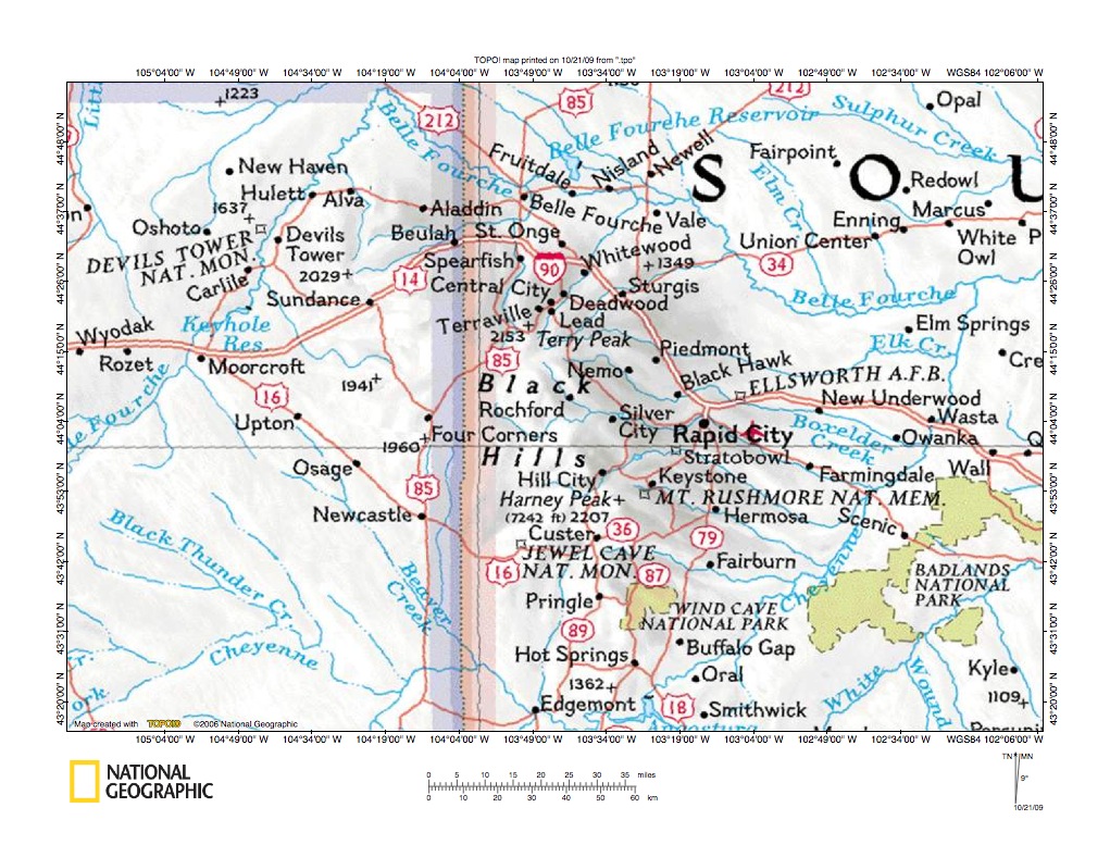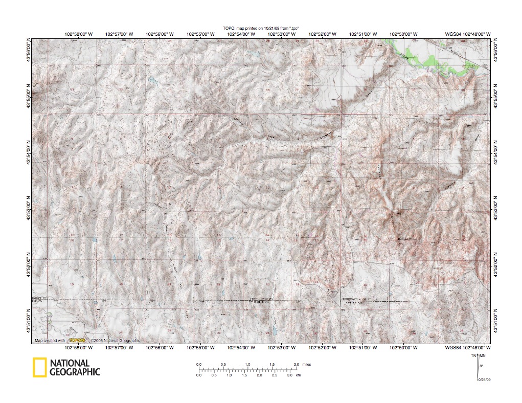 Figure 10: Rapid Creek-Spring Creek drainage divide near Cheyenne River. United States Geological Survey map digitally presented using National Geographic Society TOPO software.