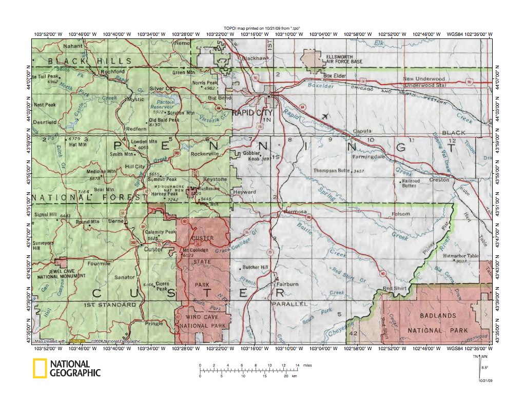 Figure 1: Rapid Creek-Spring Creek drainage divide area location map (select and click on maps to enlarge). National Geographic Society map digitally presented using National Geographic Society TOPO software.