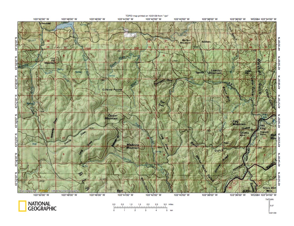 Figure 9: Rapid Creek-Spring Creek drainage divide at Lindsey Draw. United States Geological Survey map digitally presented using National Geographic Society TOPO software.