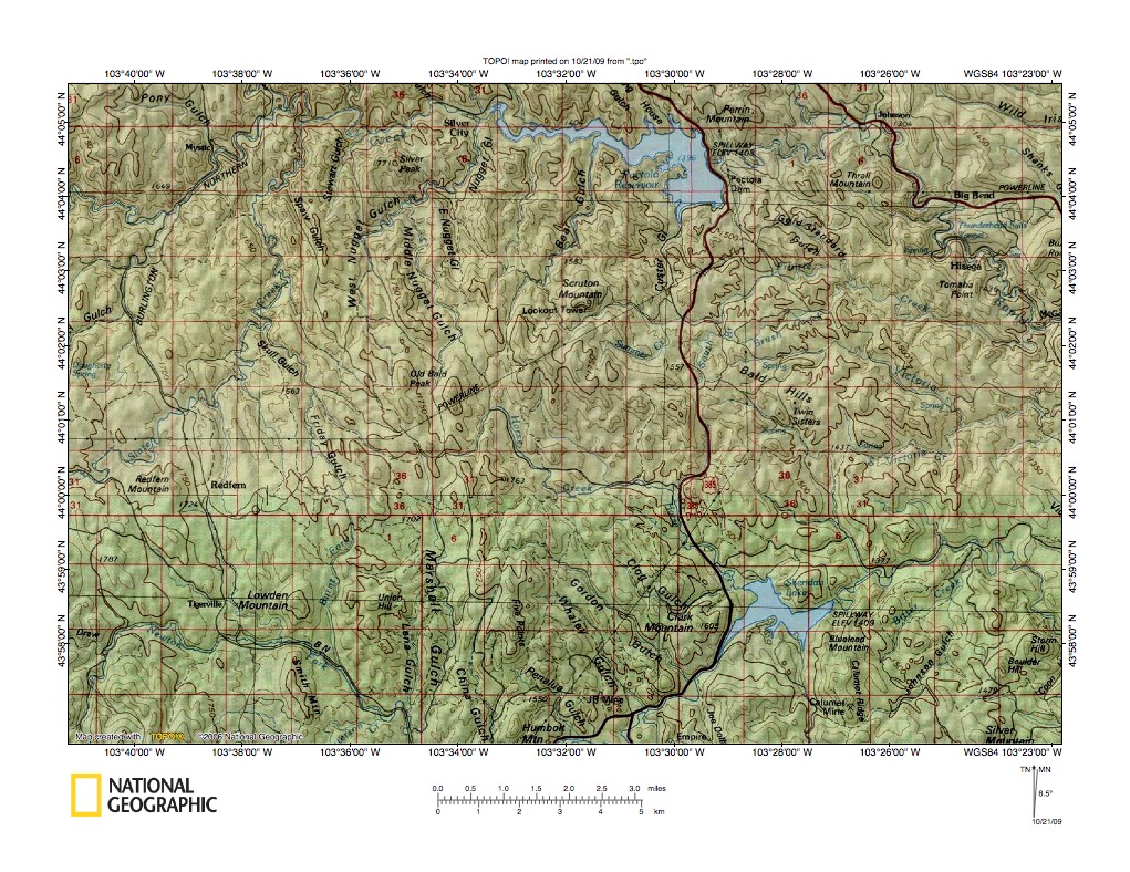 Figure 6: Rapid Creek-Spring Creek drainage divide in Pactola Reservoir and Sheridan Lake area. United States Geological Survey map digitally presented using National Geographic Society TOPO software.