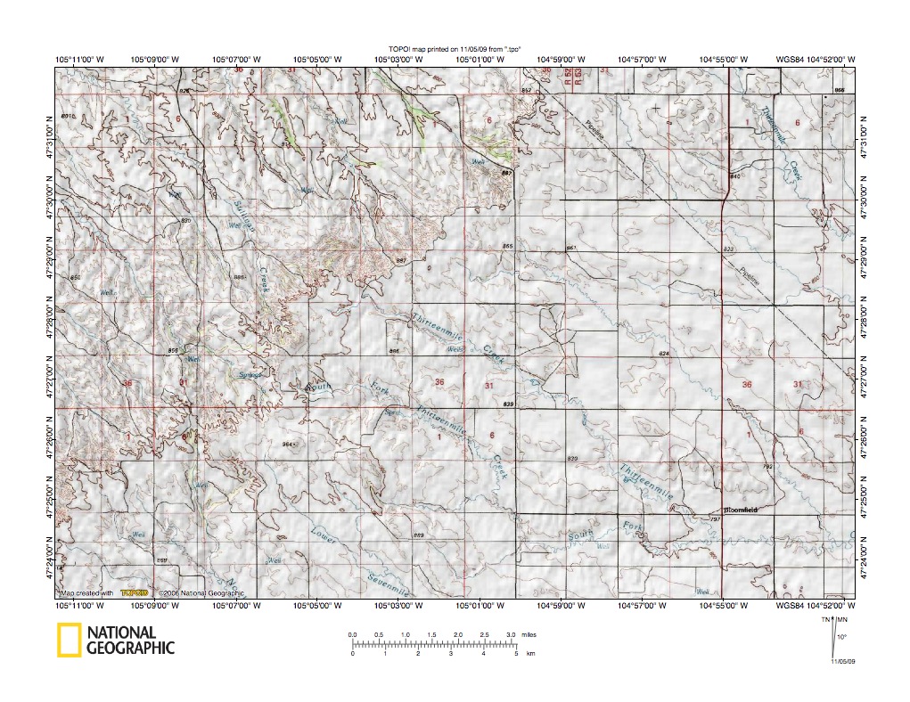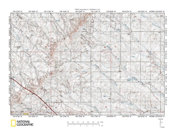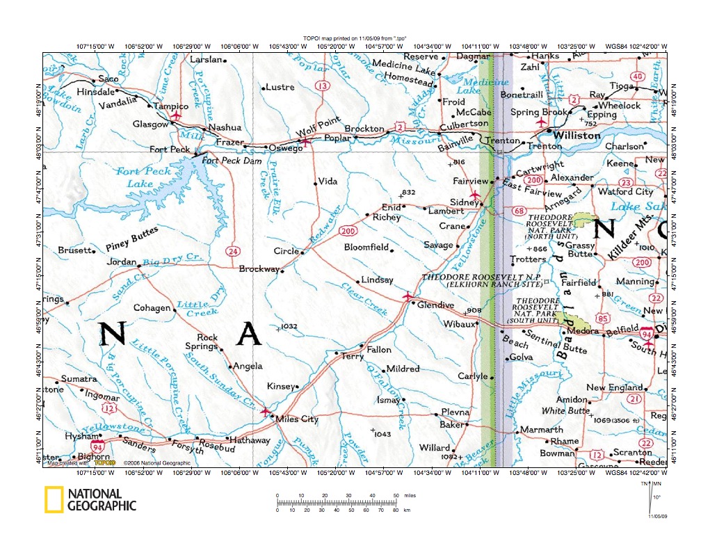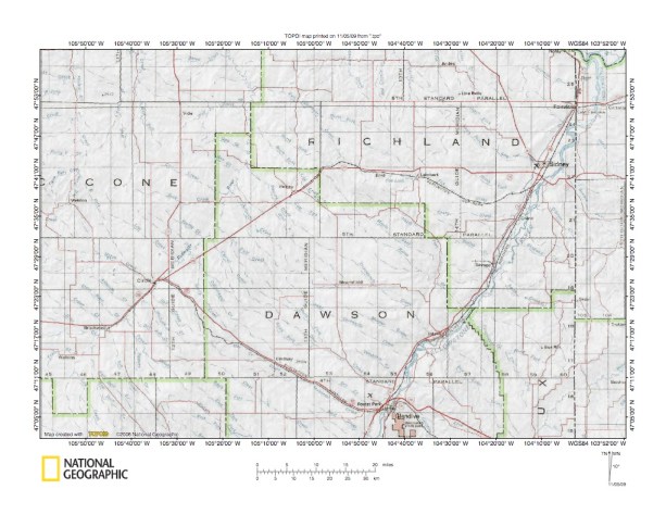 Figure 10: Yellowstone River tributaries northwest of Glendive, Montana. United States Geological Survey map digitally presented using National Geographic Society TOPO software.