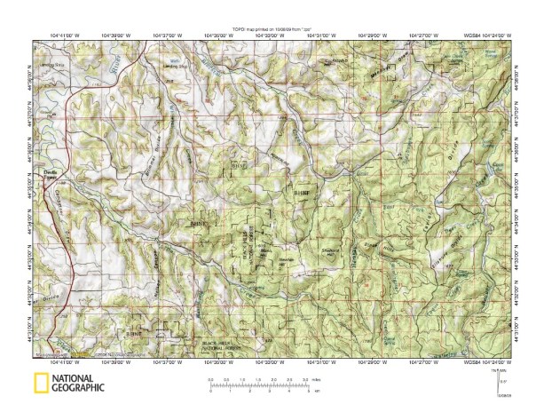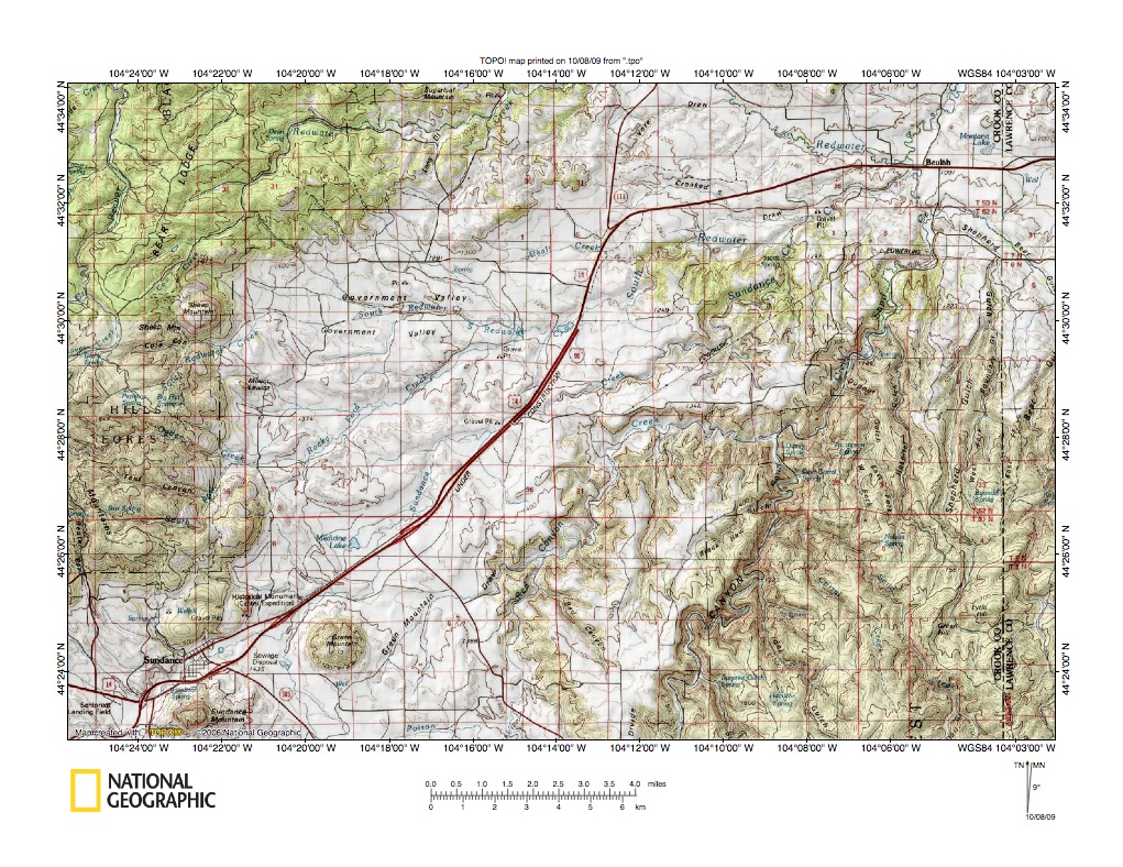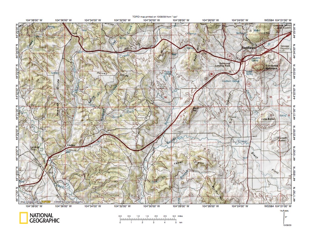 Figure 7: Belle Fourche River-Redwater River drainage divide area west of Sundance, Wyoming. United States Geological Survey map digitally presented using National Geographic Society TOPO software.
