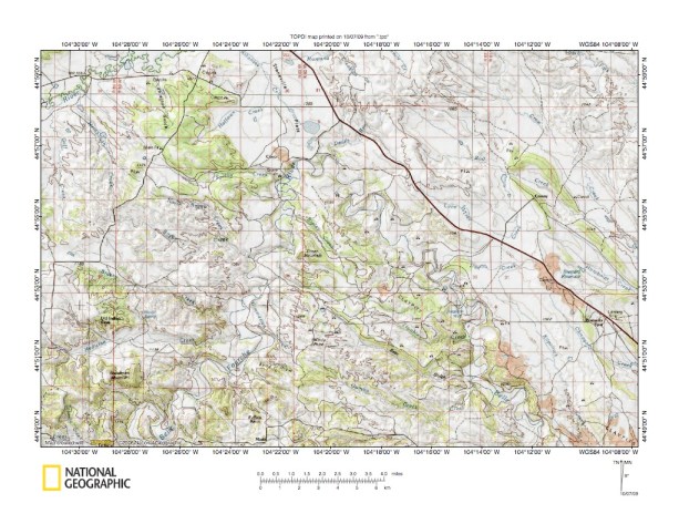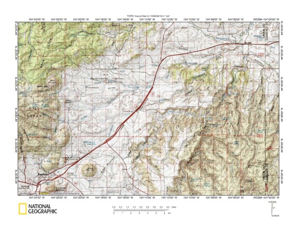 Figure 5: Belle Fourche River-Beaver Creek drainage divide area east of Hulett, Wyoming. United States Geological Survey map digitally presented using National Geographic Society TOPO software.
