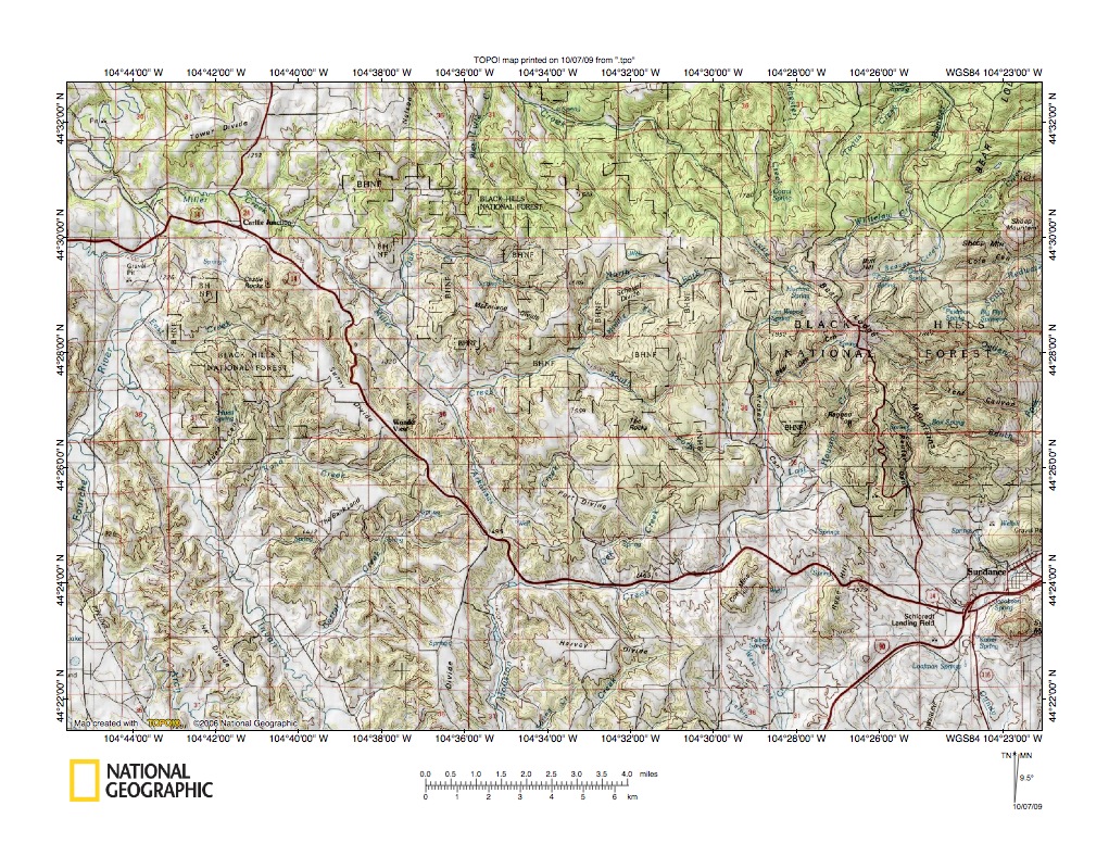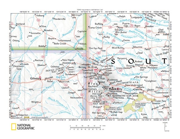Figure 1: Northeast-oriented southeast-oriented Belle Fourche River drainage divide area location map (select and click on maps to enlarge). National Geographic Society map digitally presented using National Geographic Society TOPO software.