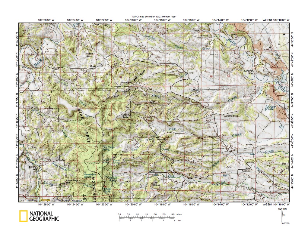 Figure 4: Northeast-oriented southeast-oriented Belle Fourche River drainage divide area north of Oak Creek. United States Geological Survey map digitally presented using National Geographic Society TOPO software.