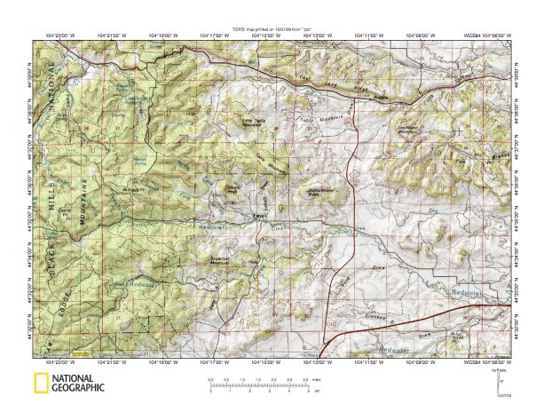 Figure 10: Beaver Creek-Redwater River drainage divide in the Bear Lodge Mountains. United States Geological Survey map digitally presented using National Geographic Society TOPO software.