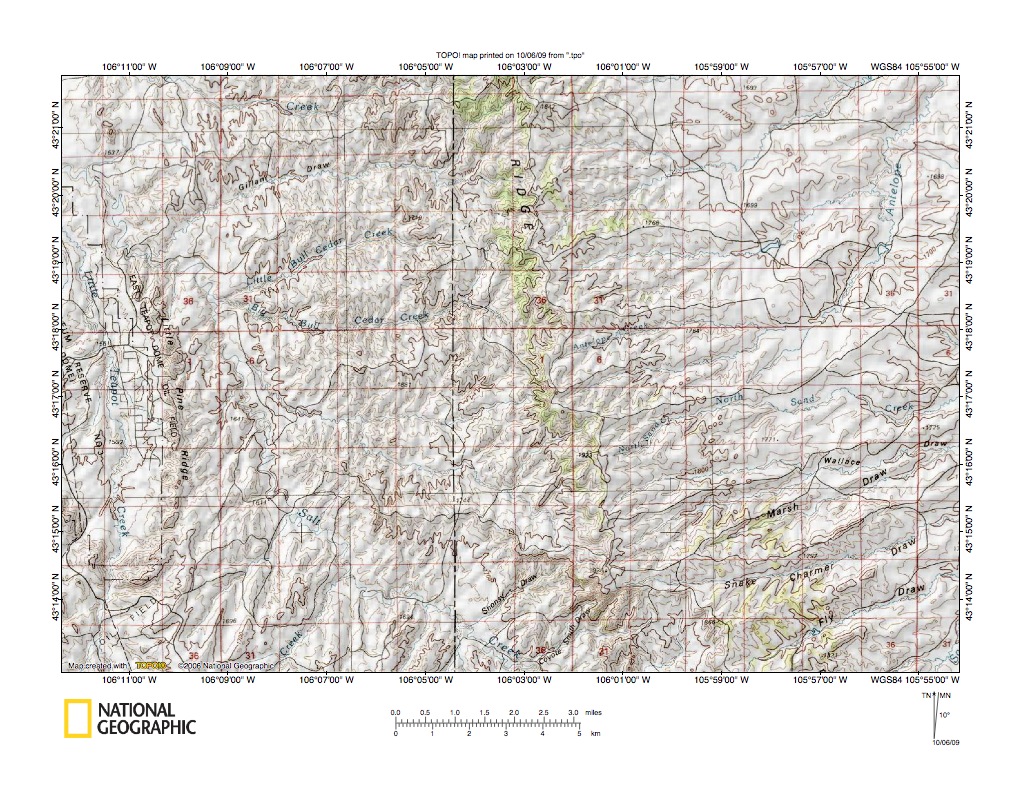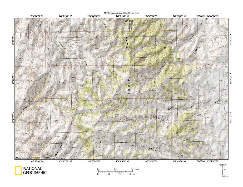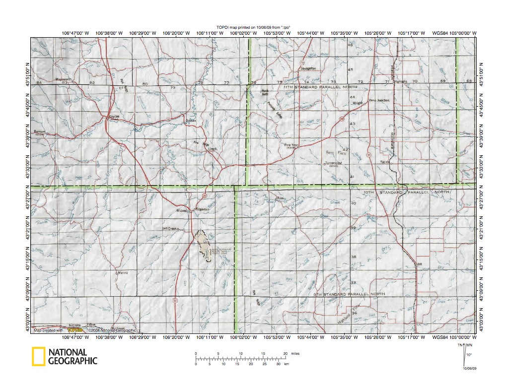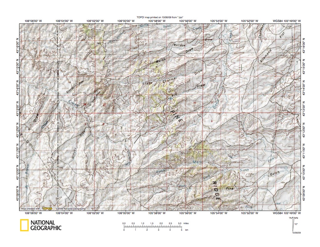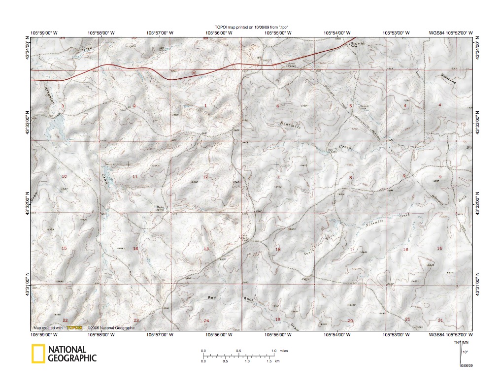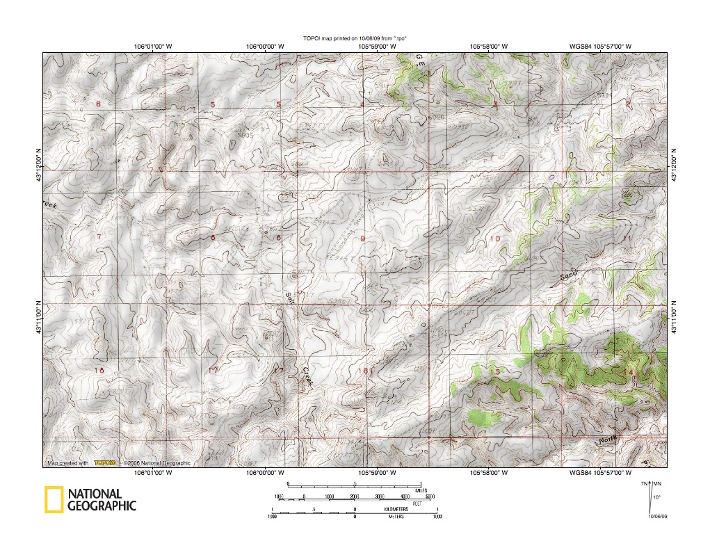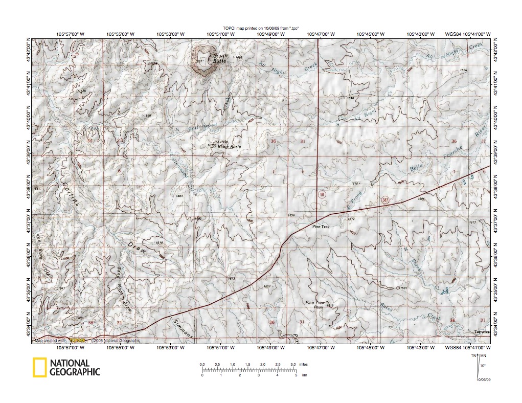 Figure 3: Powder River-Cheyenne River drainage divide area near Pine Tree, Wyoming. United States Geological Survey map digitally presented using National Geographic Society TOPO software.