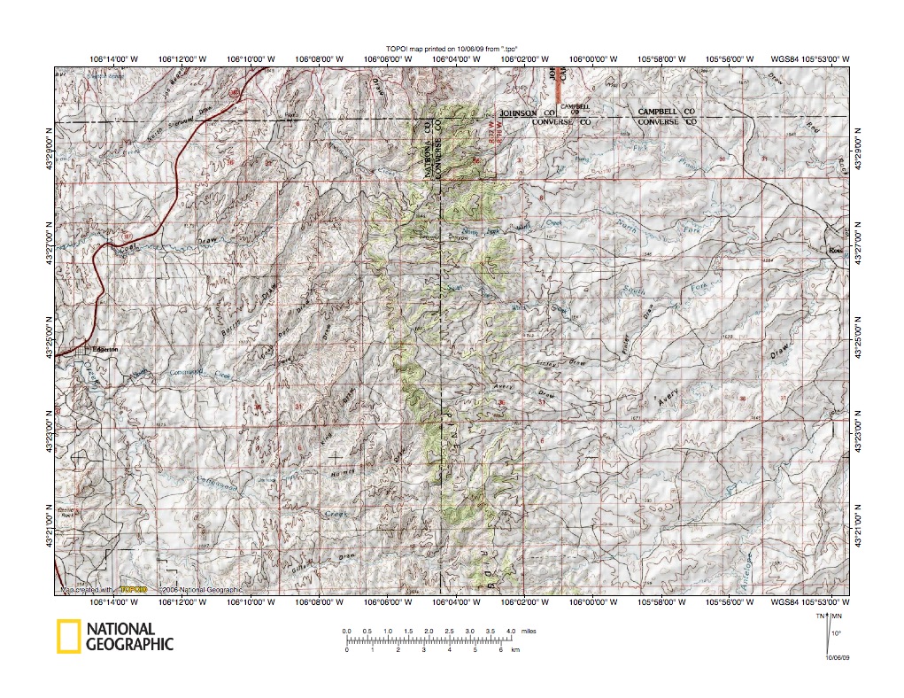 Figure 6: Powder River-Cheyenne River drainage divide area east of Edgerton, Wyoming. United States Geological Survey map digitally presented using National Geographic Society TOPO software.