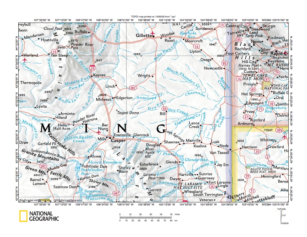 Figure 1: Powder River-Cheyenne River drainage divide area general location map (select and click on maps to enlarge). National Geographic Society map digitally presented using National Geographic Society TOPO software.