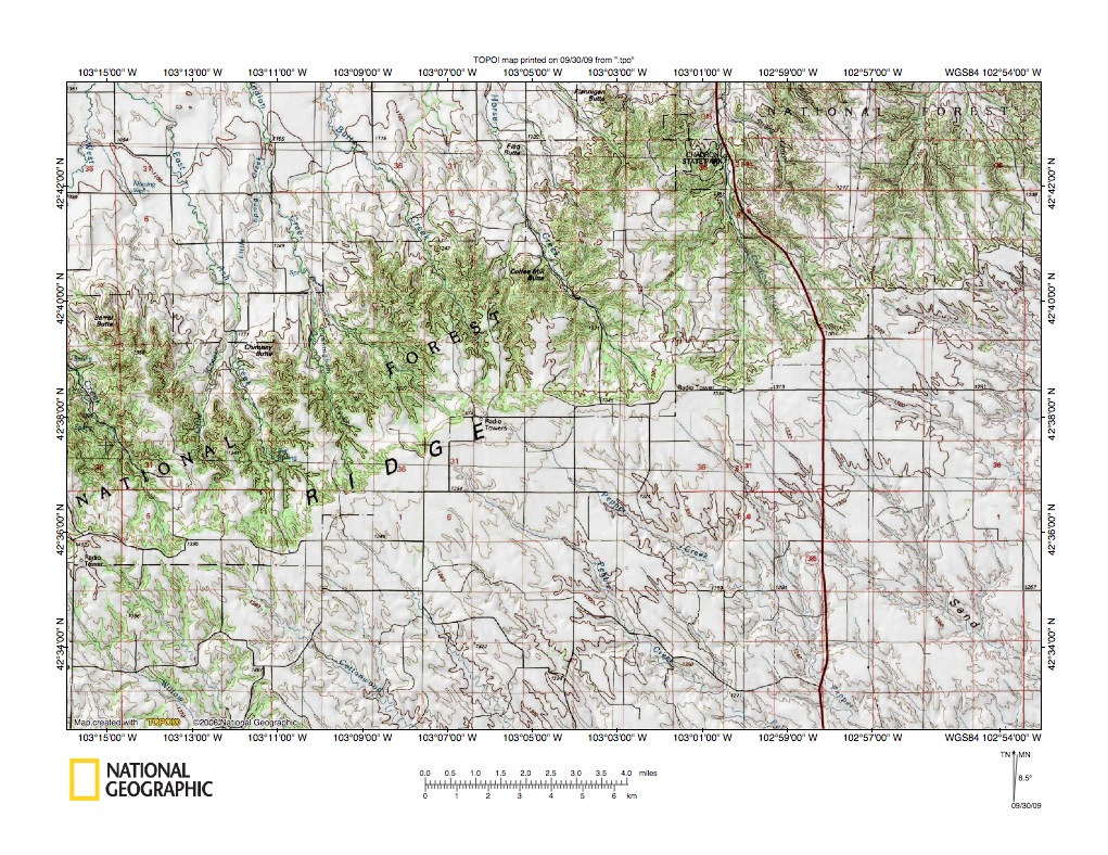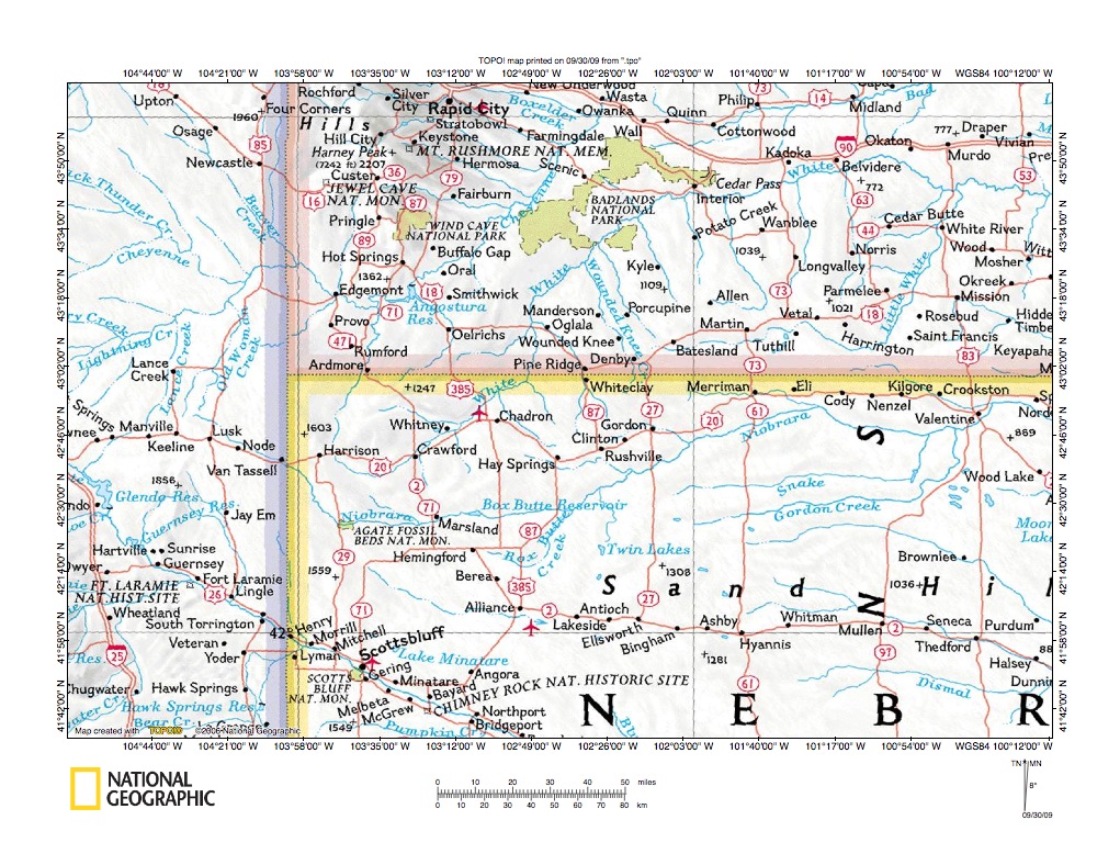 Figure 1: White River-Niobrara River drainage divide area general location map (select and click on maps to enlarge). National Geographic Society map digitally presented using National Geographic Society TOPO software.