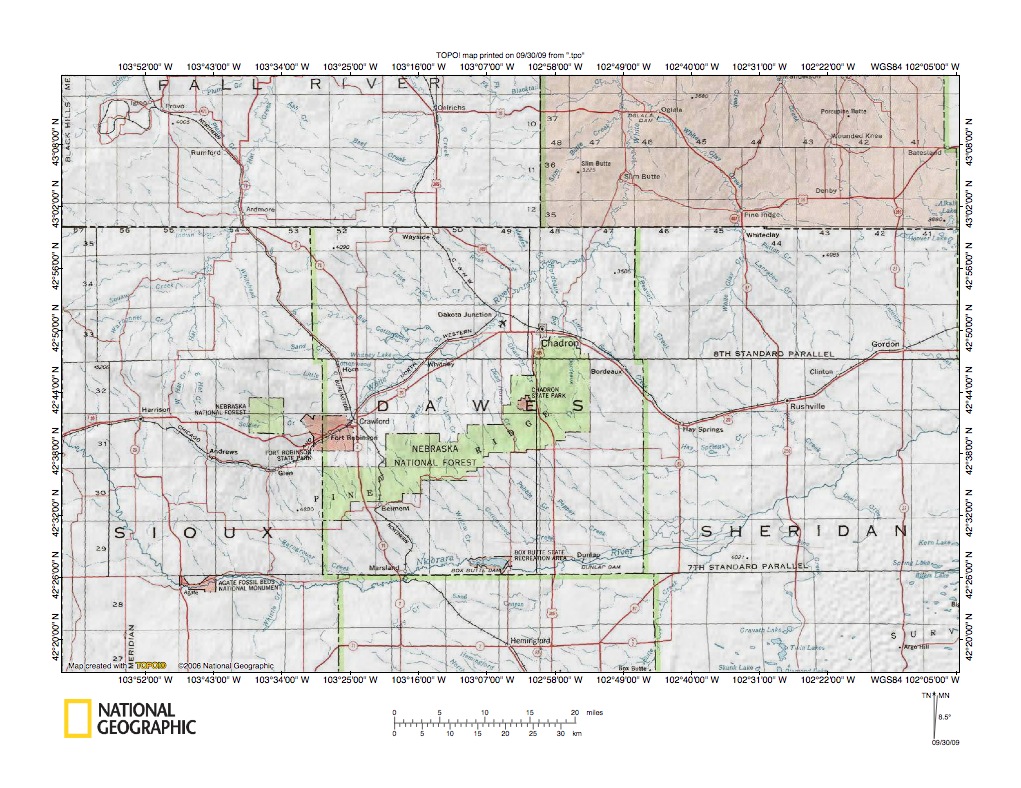 Figure 2: White River-Niobrara River drainage divide area detailed location map. United States Geological Survey map digitally presented using National Geographic Society TOPO software.