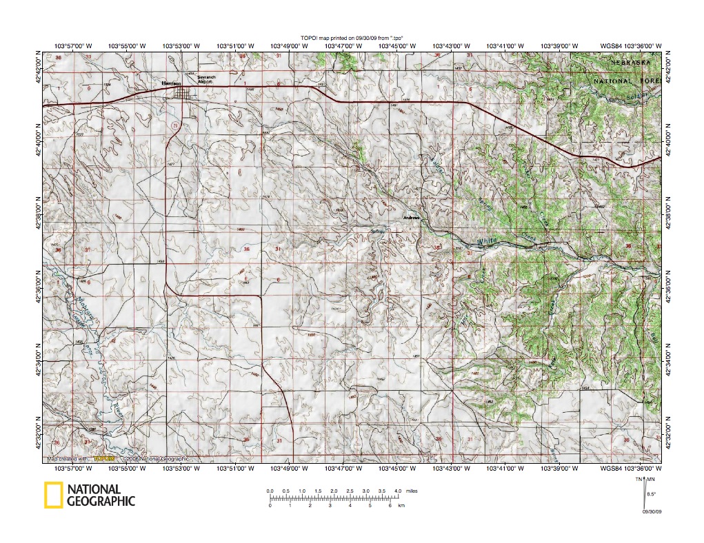 Figure 3: West end of the White River-Niobrara River drainage divide area near Harrison, Nebraska. United States Geological Survey map digitally presented using National Geographic Society TOPO software.