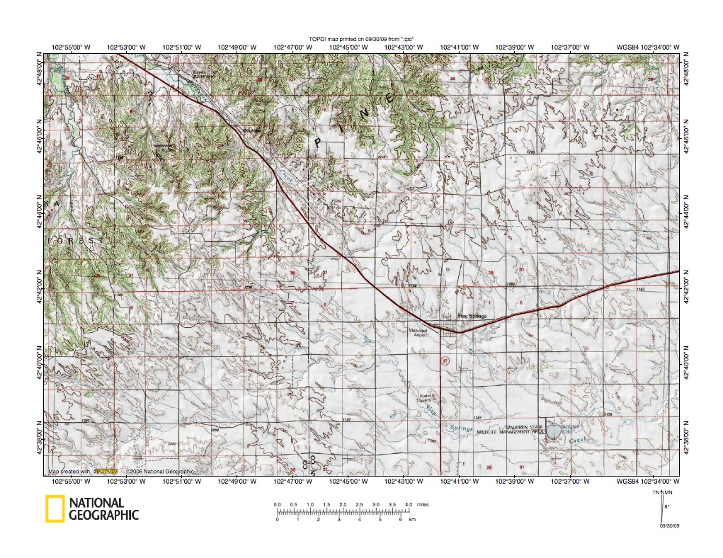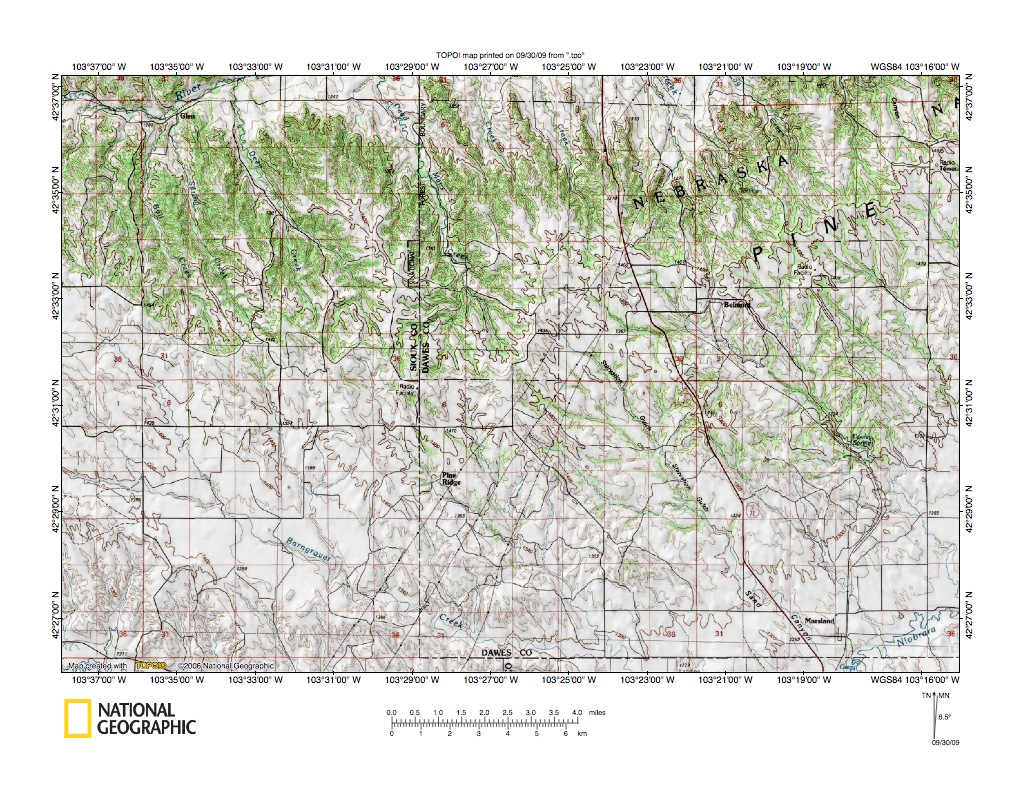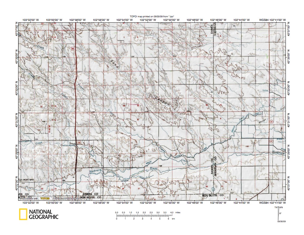 Figure 8: White River-Niobrara River drainage divide area near Hay Springs, Nebraska. United States Geological Survey map digitally presented using National Geographic Society TOPO software.