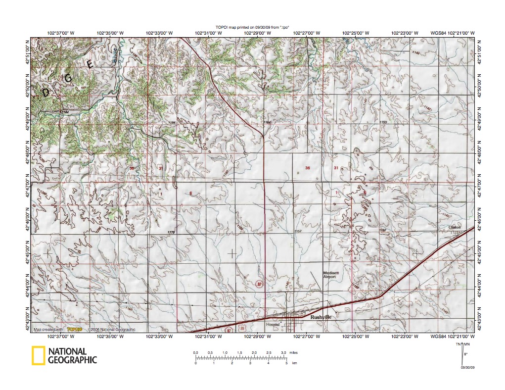 Figure 9: White River-Niobrara River drainage divide area near Rushville, Nebraska. United States Geological Survey map digitally presented using National Geographic Society TOPO software.
