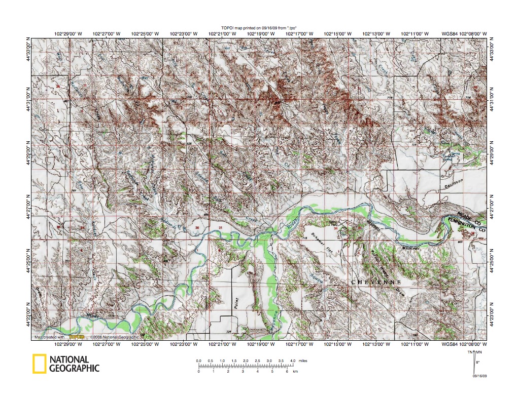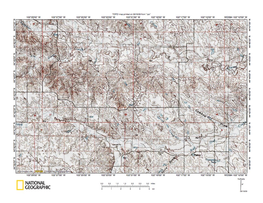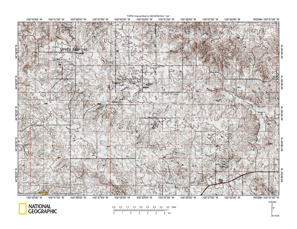 Figure 6: Red Owl Creek-Cheyenne River drainage divide area. United States Geological Survey map digitally presented using National Geographic Society TOPO software.