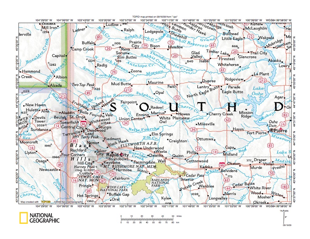 Figure 1: Cherry Creek-Cheyenne River drainage divide area general location map. National Geographic Society map digitally presented using National Geographic Society TOPO software.