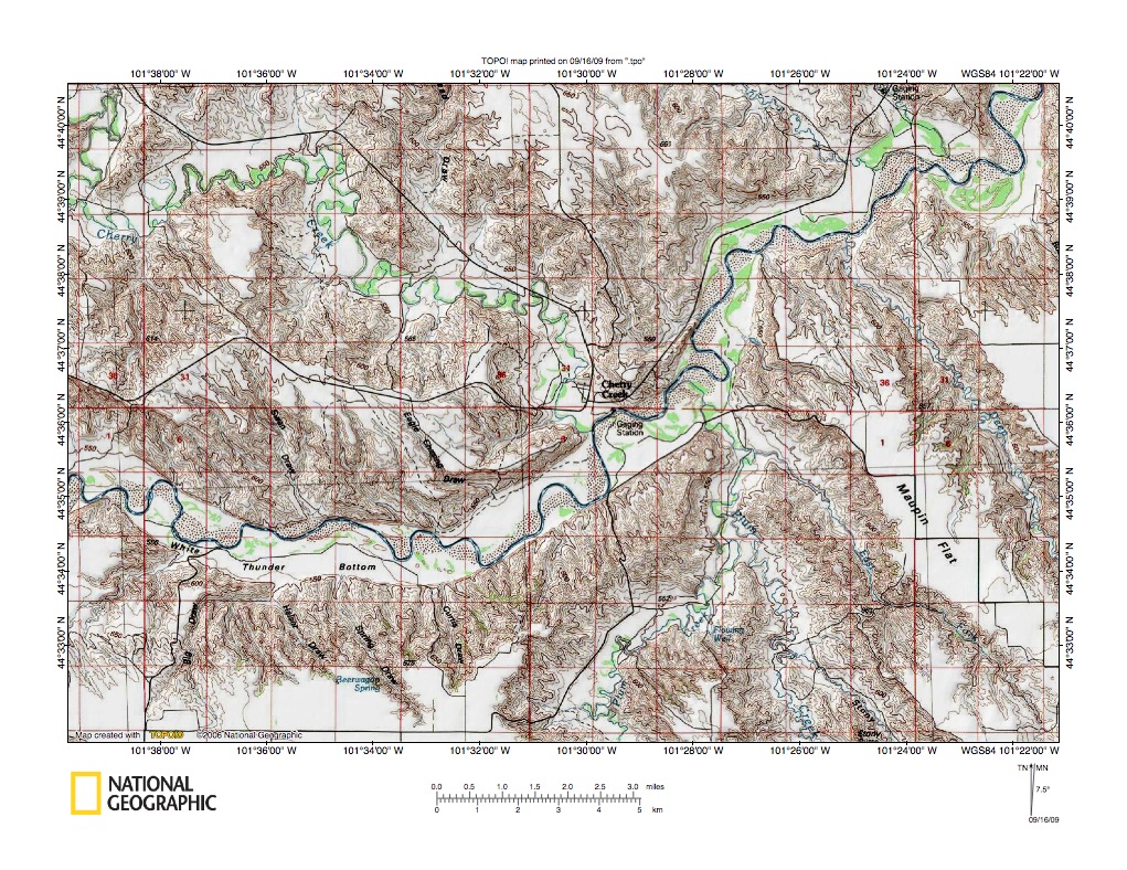 Figure 3: Cherry Creek-Cheyenne River confluence area. United States Geological Survey map digitally presented using National Geographic Society TOPO software.