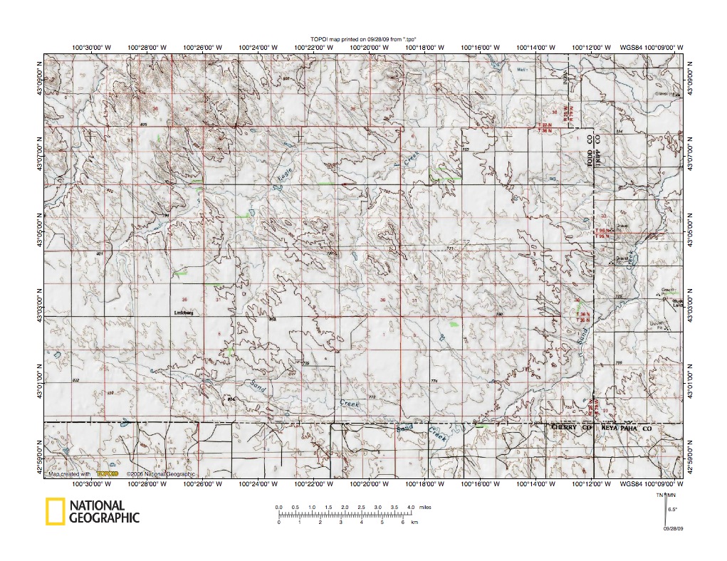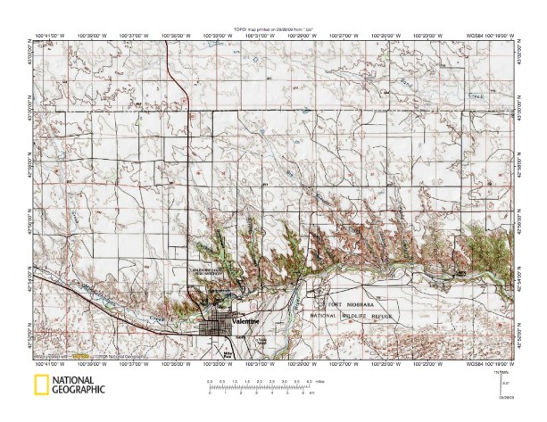 Figure 6: Sand Creek-Niobrara River drainage divide near Valentine, Nebraska. United States Geological Survey map digitally presented using National Geographic Society TOPO software.