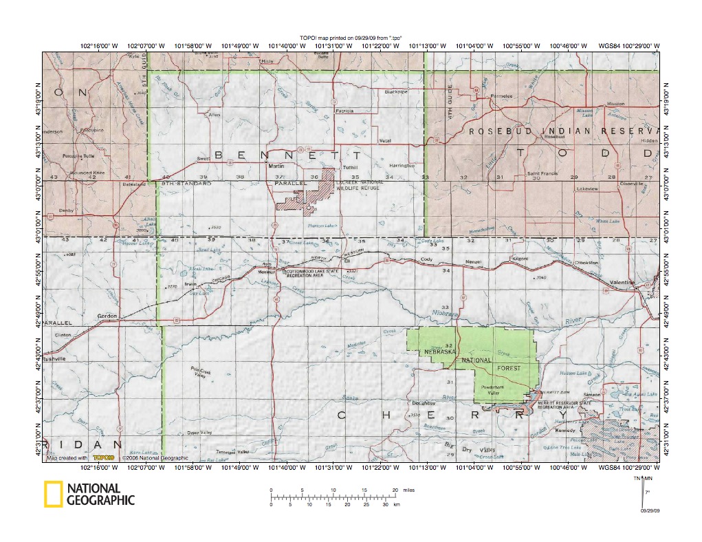 Figure 1: Little White River-Niobrara River drainage divide area general location map (select and click on maps to enlarge). National Geographic Society map digitally presented using National Geographic Society TOPO software.
