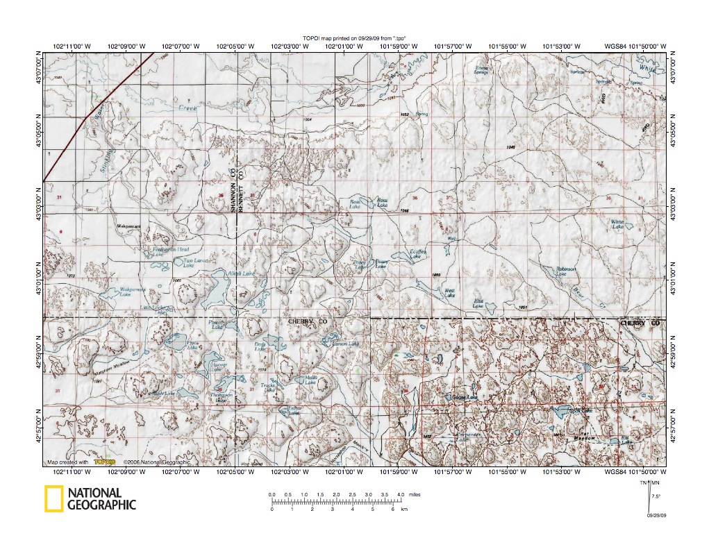 Figure 10: Wounded Knee Creek-Antelope Creek drainage divide area. United States Geological Survey map digitally presented using National Geographic Society TOPO software.