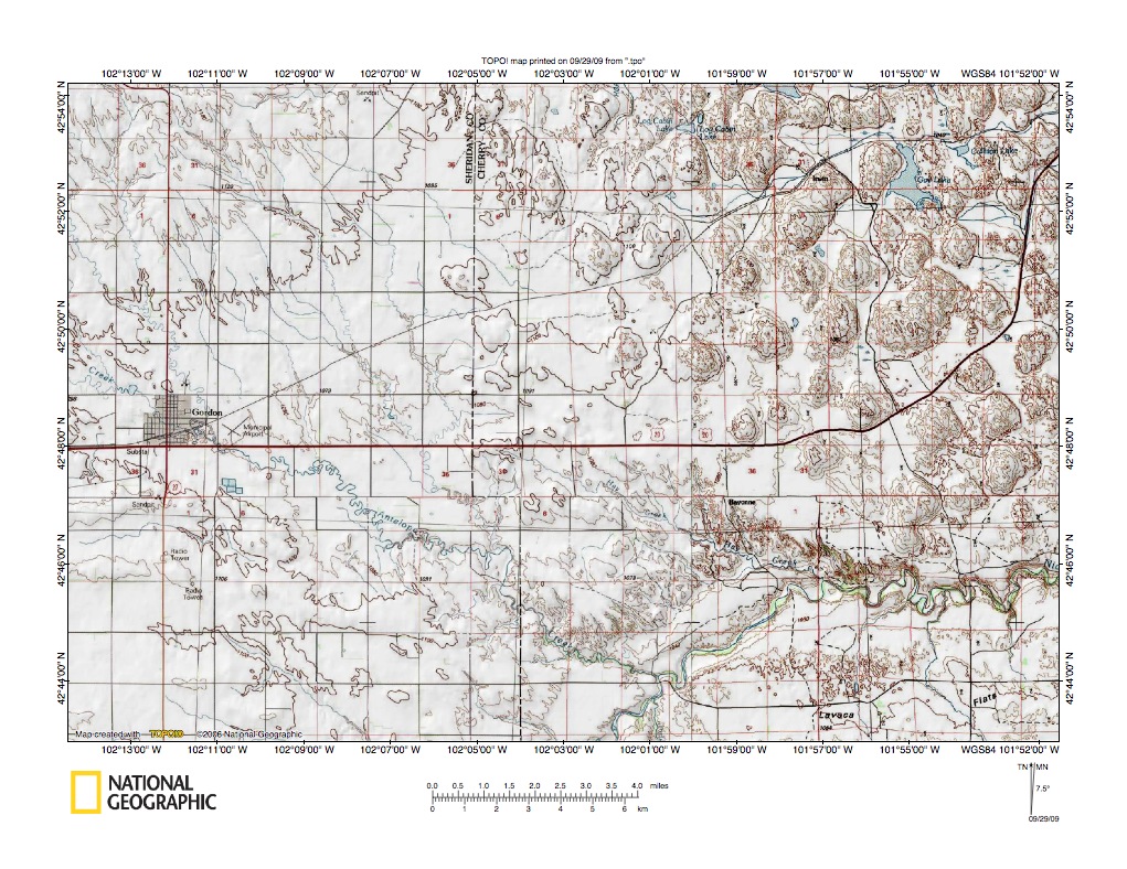 Figure 9:Antelope Creek valley southeast end near Gordon, Nebraska. United States Geological Survey map digitally presented using National Geographic Society TOPO software.