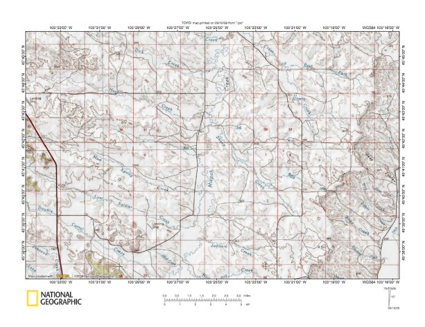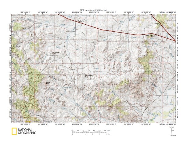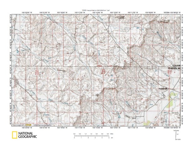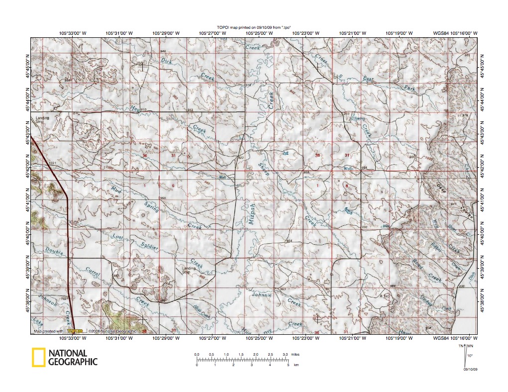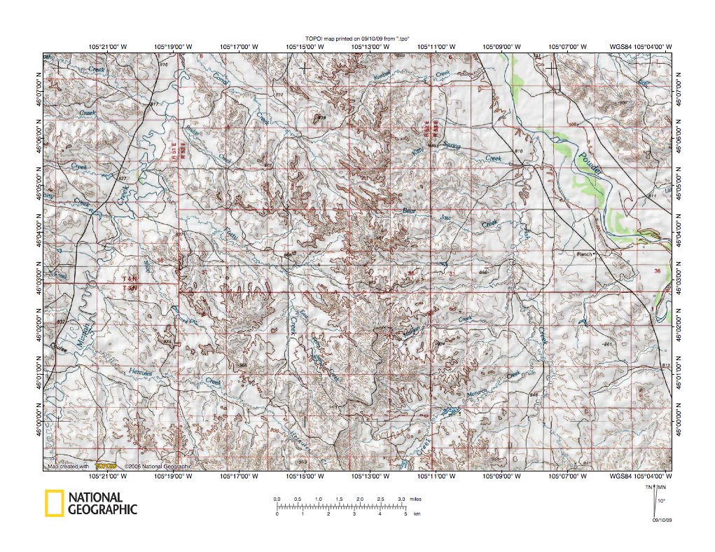 Figure 3: Mizpah Creek-Powder River drainage divide south of Mizpah Creek-Powder River confluence. United States Geological Survey map digitally presented using National Geographic Society TOPO software.