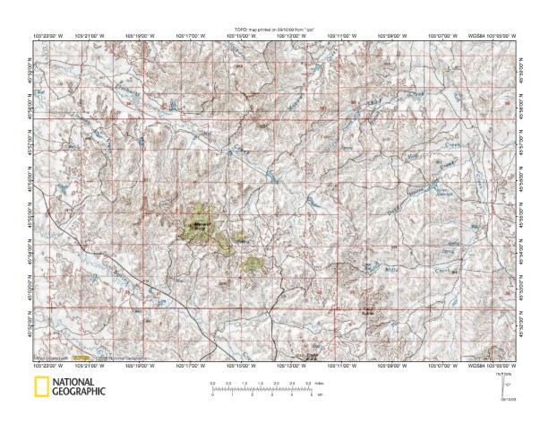 Figure 2: Mizpah Creek-Powder River drainage divide area detailed location map. United States Geological Survey map digitally presented using National Geographic Society TOPO software.