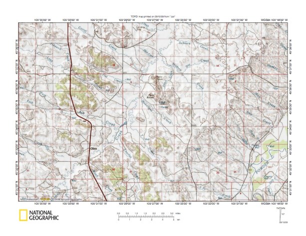 Figure 6: Mizpah Creek-Powder River drainage divide area west of Powderville. United States Geological Survey map digitally presented using National Geographic Society TOPO software.