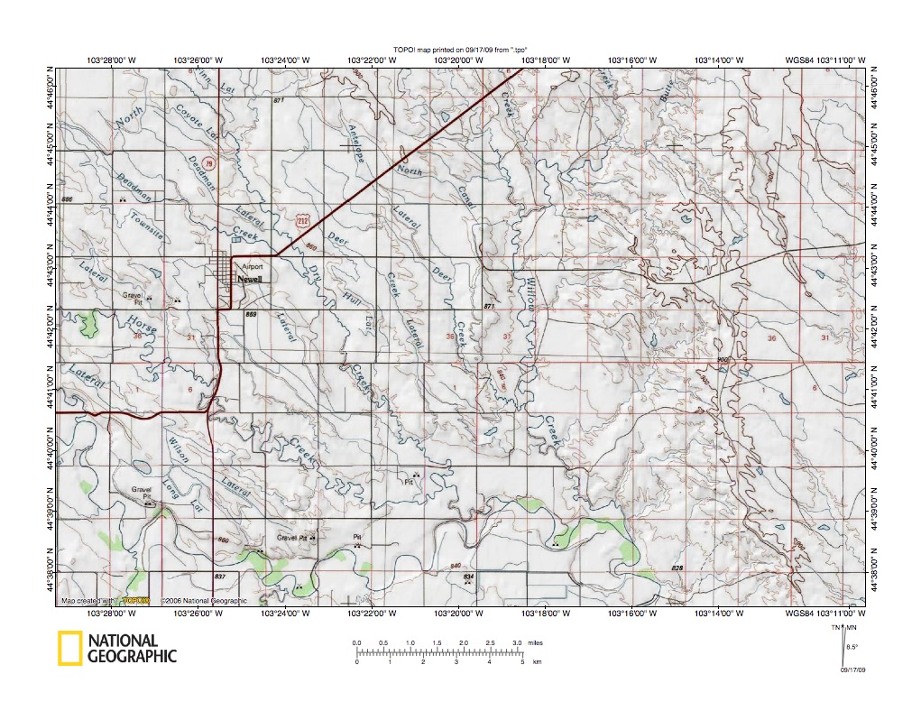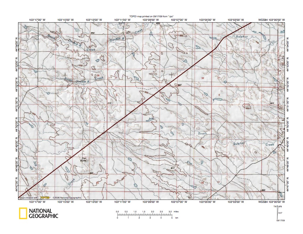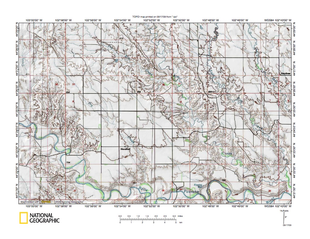 Figure 10: Elm Creek and Belle Fourche River near Hereford, South Dakota. United States Geological Survey map digitally presented using National Geographic Society TOPO software.