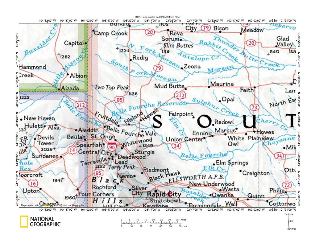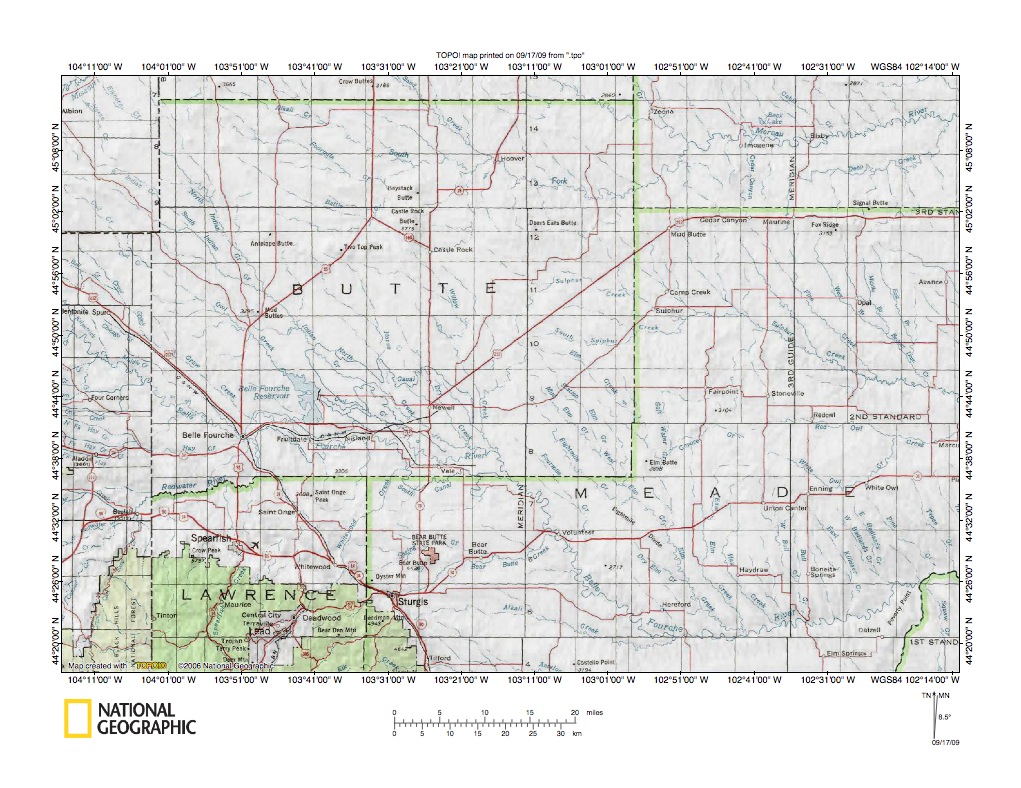 Figure 1: Moreau River-Belle Fourche River drainage divide area general location map (select and click on maps to enlarge). National Geographic Society map digitally presented using National Geographic Society TOPO software.