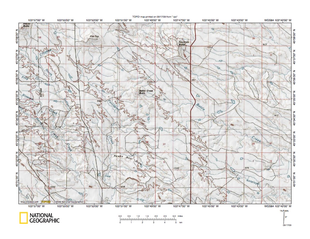 Figure 4: Moreau River-Belle Fourche River drainage divide near Battle Creek Butte. United States Geological Survey map digitally presented using National Geographic Society TOPO software.