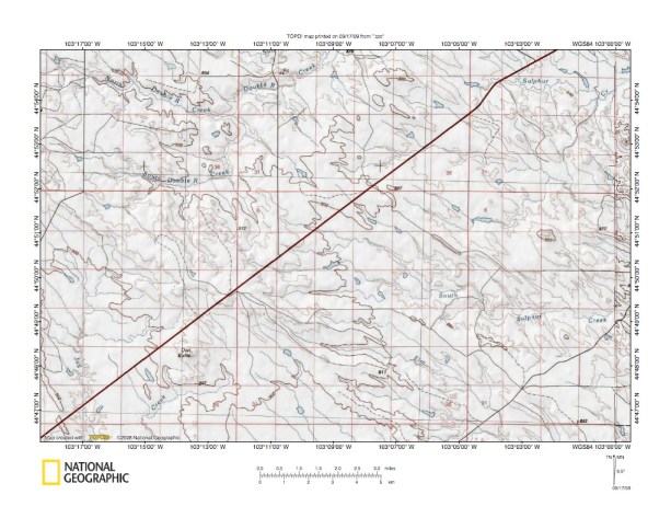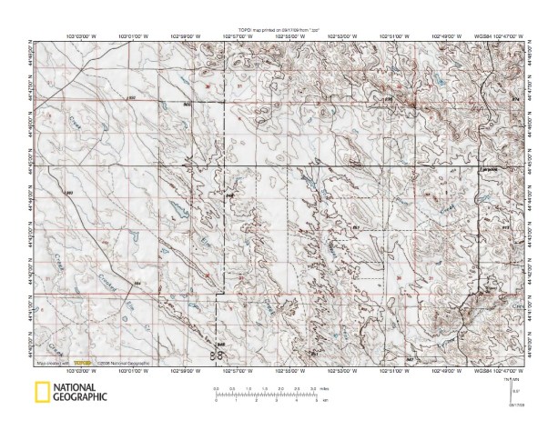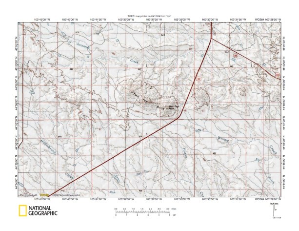 Figure 3: Little Missouri River-Moreau River-Belle Fourche River drainage divide area. United States Geological Survey map digitally presented using National Geographic Society TOPO software.